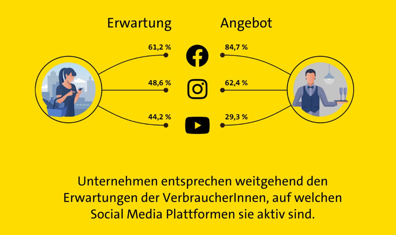 Dabei vertrauen die Unternehmen ganz besonders auf Facebook: 84,7 Prozent derer, die auf Social Media aktiv sind, gaben an, dort mit einem Account vertreten zu sein. Aber auch Instagram (62,4 Prozent) und YouTube (29,3) spielen eine mehr oder weniger große Rolle. Mit dieser Strategie befriedigen Unternehmen auch weitgehend die Erwartungen der Verbraucher*innen, die ebenfalls am ehesten auf Facebook (61,2 Prozent), bei Instagram (48,6 Prozent) und auf YouTube (44,2 Prozent) Unternehmenspräsenzen erwarten würden.