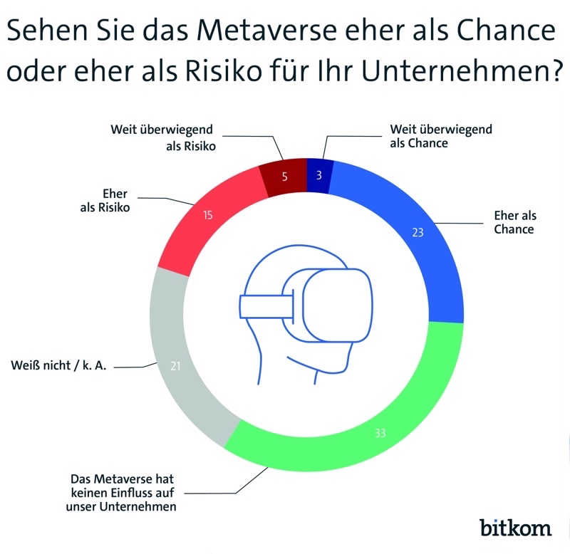 Jedes Vierte (26 Prozent) sieht im Metaverse eine Chance für das eigene Unternehmen, jedes Fünfte (20 Prozent) ein Risiko. Ein Drittel (33 Prozent) geht davon aus, dass das Metaverse keinen Einfluss auf das eigene Unternehmen hat, 21 Prozent trauen sich noch keine Einschätzung zu. Das ist das Ergebnis einer repräsentativen Befragung von 604 Unternehmen ab 20 Beschäftigten in Deutschland im Auftrag des Digitalverbands Bitkom.
