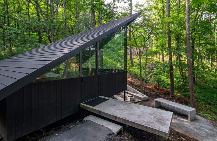 Es ist umgeben von Bäumen, mit so vielen Glasfronten, getaucht in ein derart freundlich-warmes Licht, dass es dem Bewohner das Gefühl gibt, er würde sich direkt im Freien aufhalten. Im unteren Geschoss, neben dem Kamin oder der in Holz gehaltenen Küche gilt dies ebenso wie in den zwei Schlafzimmern im oberen Stockwerk. Der aktuelle Besitzer des Hauses hat noch ein Studio bestehend aus einem Schlafzimmer dazugebaut. Mit seiner abfallenden Decke gibt es dort eine spektakuläre Sicht auf Baumkronen und auf den Himmel.