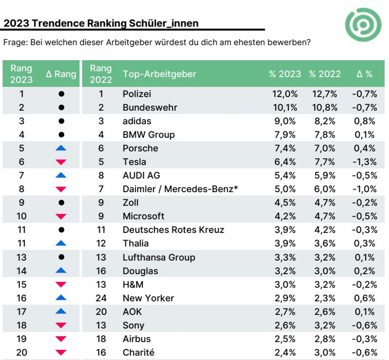 Großer Verlierer des diesjährigen Rankings ist der Aufsteiger des vergangenen Jahres. Der Automobilhersteller Tesla fiel auf der Beliebtheitsskala zwar "nur" von Platz 5 auf 6, verzeichnete aber prozentual die größten Stimmenverluste. Aufsteigende Tendenz registrierten die Trendence-Analysten dagegen vor allem bei Porsche (von 6 auf 5), dem Modeunternehmen New Yorker (von 24 auf 16) sowie bei Aldi Süd (von 35 auf 22) und Volkswagen (von 35 auf 28).