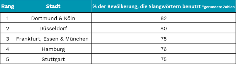Mehr als vier von fünf Dortmundern und Kölnern verwenden Slangwörter im Alltag und sind damit die offiziellen deutschen Hauptstädte des Slangs. Dicht gefolgt auf Platz zwei liegt Düsseldorf, hier nutzen 80 Prozent der Bewohner Slang, während in Frankfurt 78 Prozent der Bevölkerung Slang verwendet.