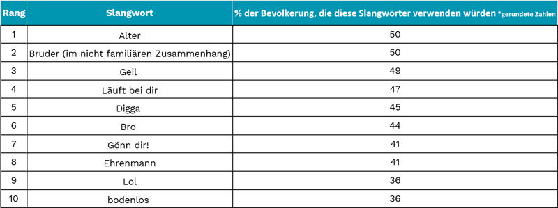 Die Umfrage zeigt auch, dass 47 Prozent der Deutschen es für angemessen halten, Slang in einem beruflichen Umfeld zu verwenden, während nur fünf Prozent Slang in einem Gespräch mit dem Vorgesetzten benutzen würden.