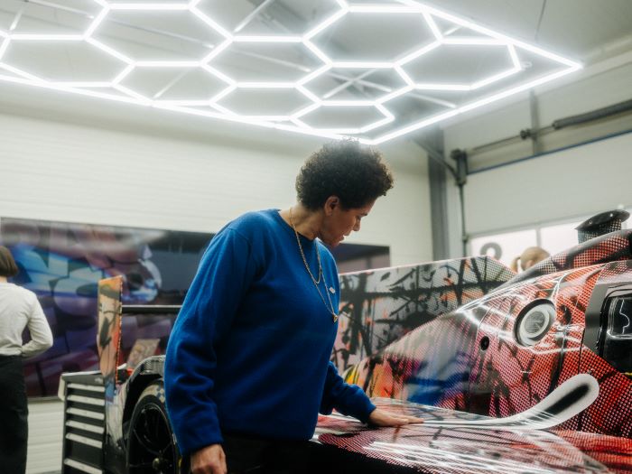Julie Mehretu, bekannt für ihre Werke, die Raum, Bewegung und Energie thematisieren, überführte für die Gestaltung des 20. BMW Art Car ein zweidimensionales Bildmotiv in eine dreidimensionale Darstellung. "Ich sah das Modell des BMW M Hybrid V8 vor dem fertigen Gemälde in meinem Studio und überlegte mir, was wohl passieren würde, wenn sich das Fahrzeug durch das Bild bewegen und mit ihm verschmelzen könnte. Jetzt ist das BMW Art Car ein Remix meines Bildes, und es wirkt, als hätte seine Kühlergrill-Niere das Gemälde eingeatmet."