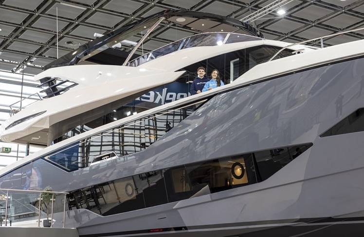 Während Start-ups und OEMs um Marktanteile bei kleinen bis mittleren Elektromodellen ringen, zeigt sich in Halle 6 der weiterhin ungebrochene Boom im Superyachtsegment. Die britische Werft Sunseeker stellt mit der 90 Ocean ein 85 Tonnen schweres Modell mit geschlossener Flybridge vor – Preis: zwischen acht und zehn Millionen Euro, je nach Ausstattung. Die Yacht wurde bereits im Dezember auf eigenem Kiel über den Rhein nach Düsseldorf überführt.